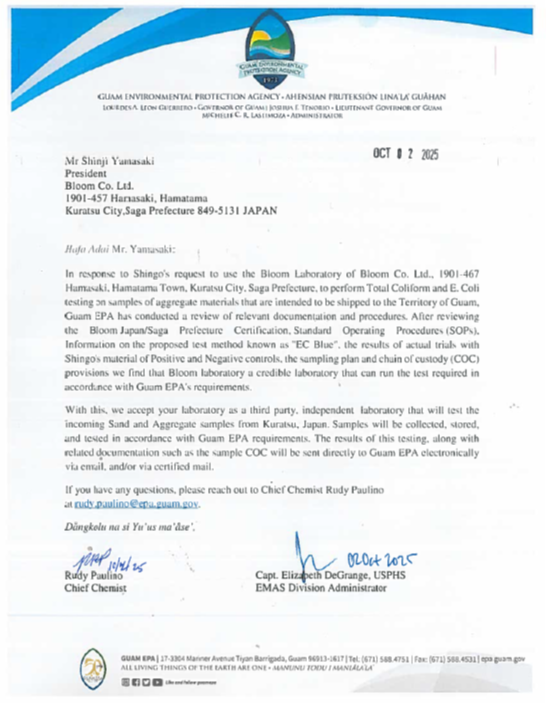 2025年10月2日にアメリカ合衆国のGuam EPA(GUAM ENVIRONMENTAL PROTECTION AGENCY)から佐賀県唐津市の株式会社ブルームのBloom laboratoryが唐津港で積載される砕石や砂の大腸菌の試験検査を実施する第三者機関として認定されました。