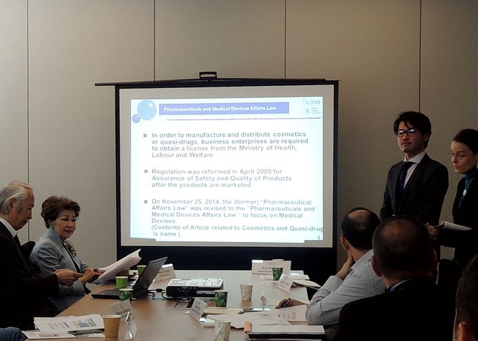 フランス側に日本市場の現況などが説明され、弊社は「化粧品の輸入規制と輸入化粧品販売までの流れについて」を担当。以下の流れに沿って日本の薬事環境の説明を行いました。